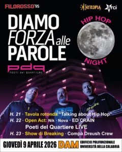 L’evento “Diamo Forza alle Parole” inizierà alle ore 21.00 con la tavola rotonda con proiezione video “Talking about Hip Hop” a cura dei PDQ – Poeti del Quartiere, che si esibiranno Live con il loro ultimo album “MegaHertz” – che fonde rap hip-hop, funk e contaminazioni new wave, capace di raccontare la realtà con la forza della poesia di strada – dopo l’open act di Nik, Nova ed ED CRAIN. Un momento di confronto aperto per discutere l’evoluzione del movimento fino alla sua attuale dimensione globale e locale.