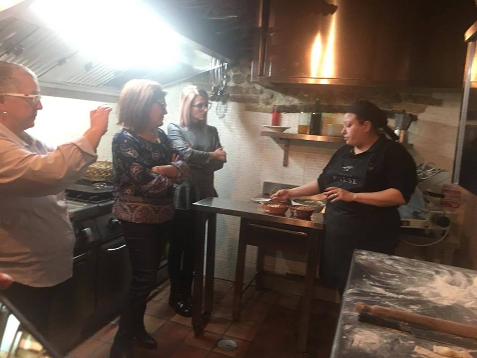 Il menù servito a tavola si è ispirato alla cucina povera cosentina e a km 0, come ha spiegato la stessa cuoca, bravissima mentore: antipasto semplice con cipolla rossa caramellata e formaggio pecorino calabrese, a seguire una gustosa e profumata zuppa di cipolla e peperoni cruschi (tipici anche della zona lucana) con pane raffermo e per concludere una ‘nghiambara, semplice frittata di acqua e farina senza uova perché – come spiega la cuoca – durante i periodi di magra le uova erano molto care.