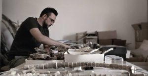 Giovanni Longo (nella foto in basso), nato a Locri, gioca in casa e lo fa lavorando il legno per dar vita a strutture scheletriche. “Preferisco spostarmi personalmente per recuperare materiali lignei sulle foci dei fiumi, cercando di valorizzare la rinascita di elementi che, altrimenti, resterebbero ignorati ed inutilizzati”, così l’artista calabrese presenta lo scheletro di un cetaceo, opera destinata al futuro museo cosentino.