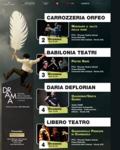 DramaFest nasce con l’obiettivo di creare un dibattito sul teatro contemporaneo attraverso percorsi di formazione, studio e scambio tra esperti, artisti, critici e pubblico. Realizzato da Libero Teatro con il sostegno della Fondazione Carical e in collaborazione con il Dipartimento di Studi Umanistici ed Entropia APS, il festival ha in programma nel teatro dell’ateneo calabrese di Rende quattro tra gli spettacoli più amati della scena contemporanea e dal pubblico. E ancora incontri con autori, registi e critici teatrali delle testate nazionali più importanti, docenti e studenti a confronto.