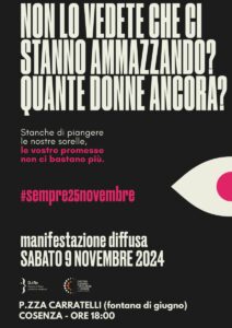 L’appuntamento è per tutte e tutti sabato 9 novembre alle ore 18:00 in Piazza Carratelli (Fontana di Giugno) a Cosenza.