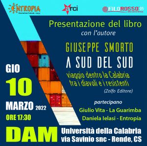 Sarà aperta a tutti invece la presentazione del libro “A Sud del Sud. Viaggio dentro la Calabria tra i diavoli e i resistenti” (Zolfo Editore), scritto dallo stesso giornalista, che si terrà a seguire sempre al DAM, con la partecipazione di con Giulio Vita de La Guarimba  e Daniela Ielasi, presidente di Entropia e direttrice responsabile del giornale.