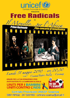 Al cineteatro Italia il prossimo 31 maggio si terrà in anteprima nazionale lo spettacolo ‘Il monello…Per l’Africa’. Protagonisti i Free Radicals che, seguendo il loro progetto di sperimentazione jazzistica hanno musicato il famoso film di Charlie Chaplin. Inserito nel cartellone degli eventi dell’Unicef di Cosenza, all’interno della campagna ‘Un goal per l’Africa’ il ricavato dei biglietti sarà devoluto interamente al progetto che intende contrastare l’hiv/aids infantili nel continente africano.